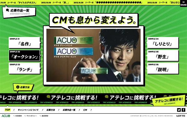 ロッテ「ACUO」の消費者参加型広告キャンペーン。「CMに、自由にアテレコして自分だけのオリジナルCMを作ろう」という内容。キャンペーン応募作品の中から選ばれた5作品には約100万円相当のプレゼントが施された。特設の応募ページに表示される電話番号に電話をかけ、アテレコする音声を吹き込む。すると、アテレコした動画が特設ページ上に表示される。ズレなどをエディター画面で調整することも可能。音声編集を終え、氏名など必要事項を記入すると応募完了となる。