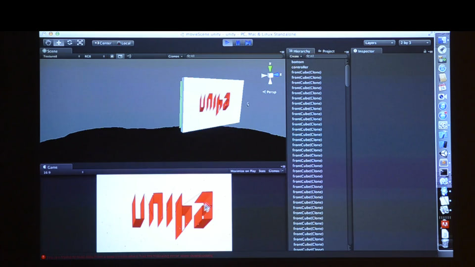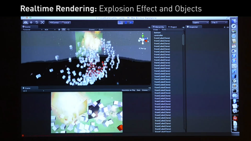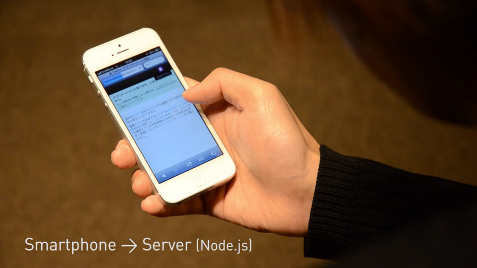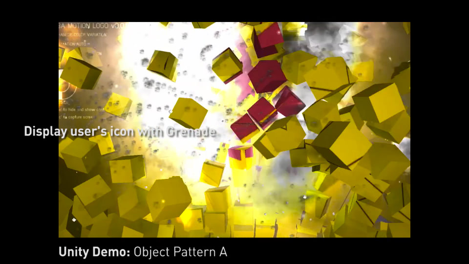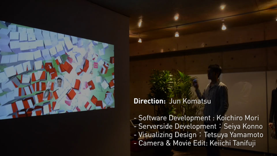 ユーザーのスマートフォンを振った角度によって、描画が変更されるシステム。Node.jsで実装されたサーバへスマートフォンからアクセスしOAuth経由でSNSでログイン。コミュニケーション・プロトコルにSocket.IOとOSC、3Dアプリケーション制作にはUnity、リアルタイムレンダリングにExplosion Effect and Objectsを使用。