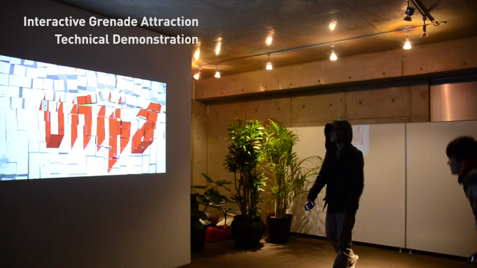 イベント会場で大勢の参加者が自分のスマートフォンで参加できるインスタレーション。スマートフォンの画面からTwitter、Facebookのアカウントで認証してログインし、スマートフォンをシェイクするとプロジェクションされたスクリーンに向かって手榴弾が飛んでいって、壁に当たって爆発するというもの。もともと、某映画作品の試写会イベント向けに企画されていたものだったが、イベントは中止となり実施できなかった。