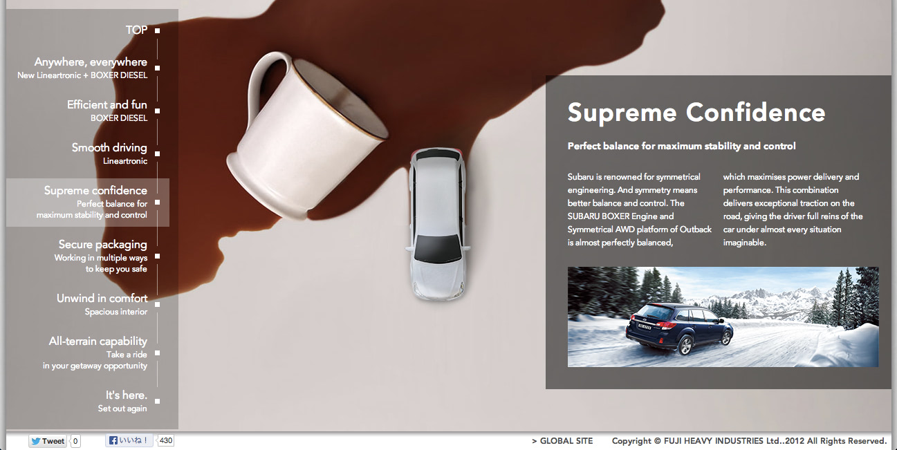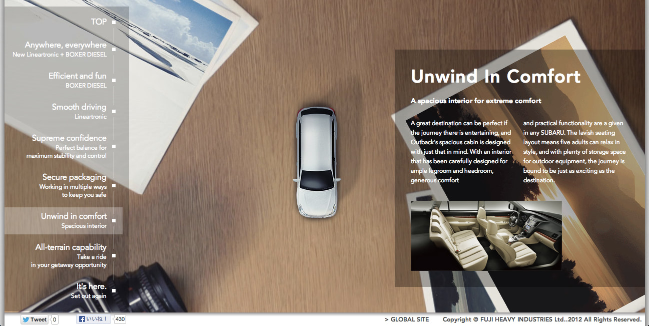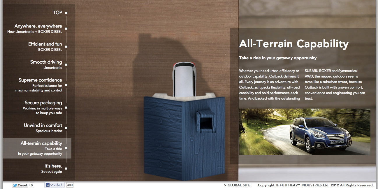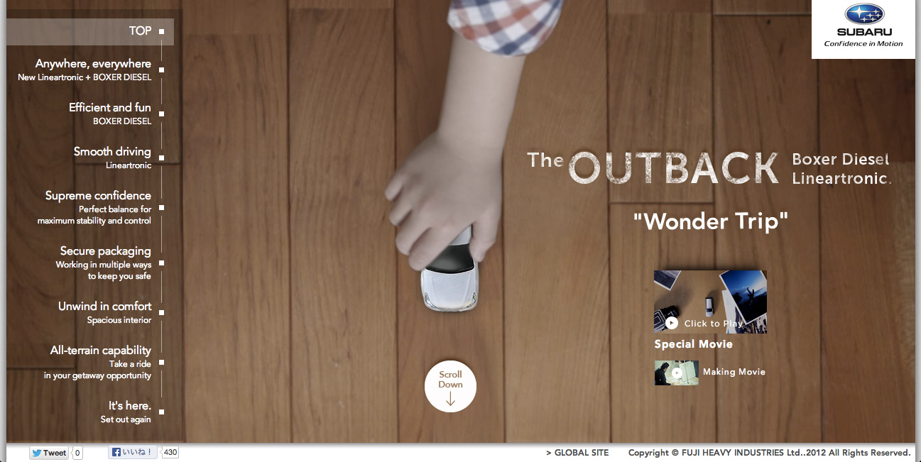 自動車メーカーのグローバル・プロモーションサイトを制作 ステーションワゴンとSUVのクロスオーバー車、SUBARU OUTBACKのグローバル・プロモーションサイト。ドイツの世界的なデザインアワード「iF Communication Designn Award 2014」のキャンペーンサイト部門にて受賞。 ユニバは、ウェブサイトを制作。スクロールに連動して、ミニチュアの車が家の中のいろいろなシーンを走っていくギミックを実装。走行する路面が変更される度に、スペックの説明が挿入される要素を入れた。
