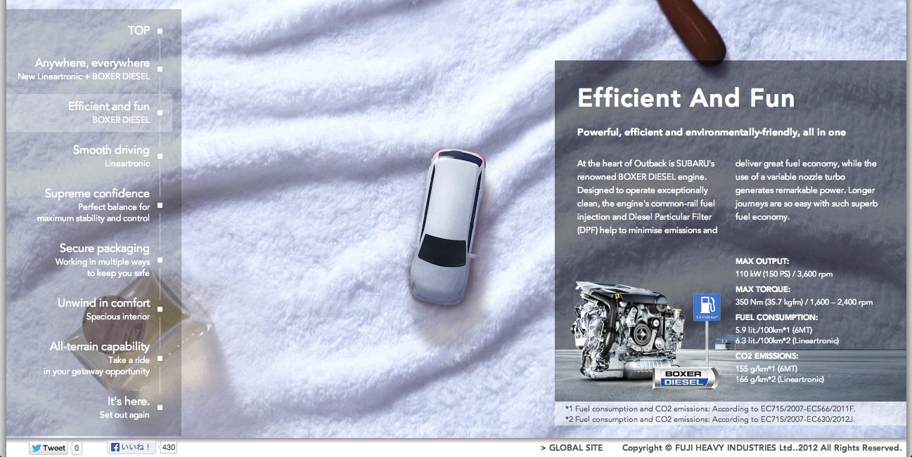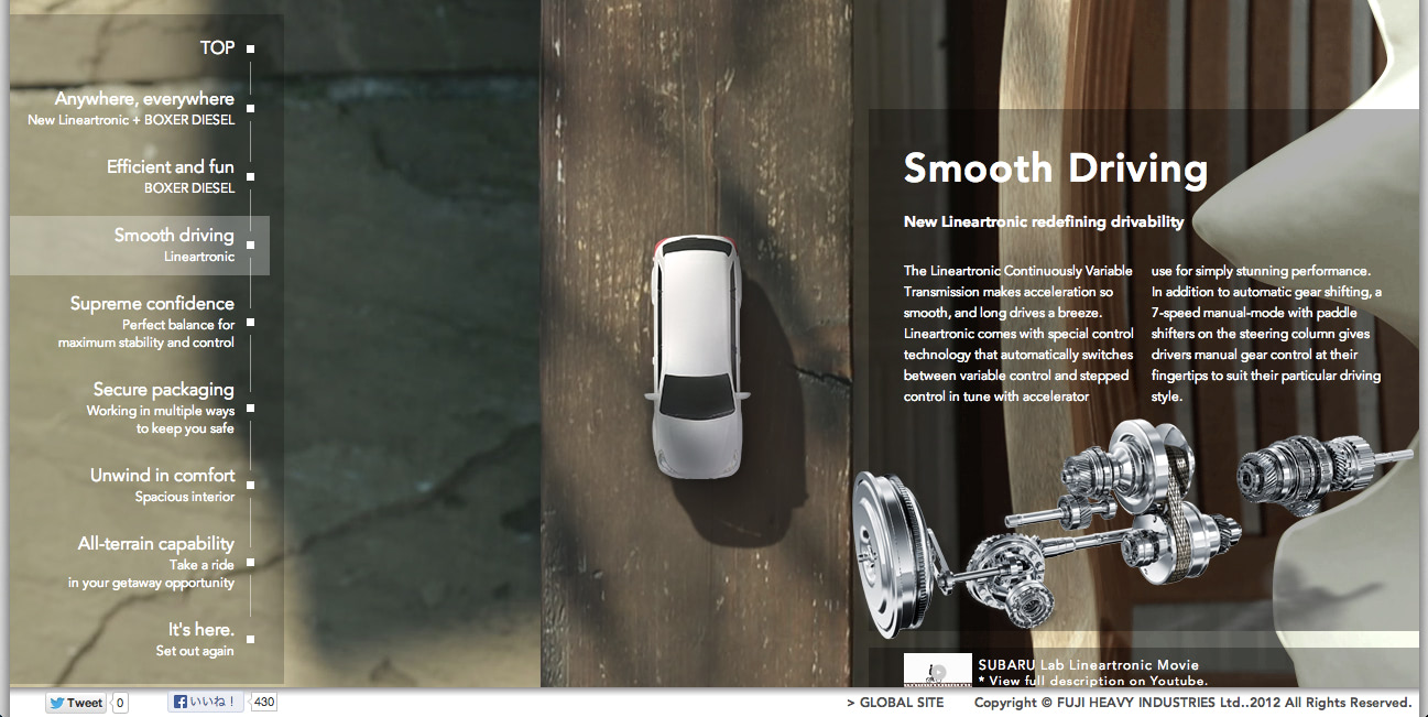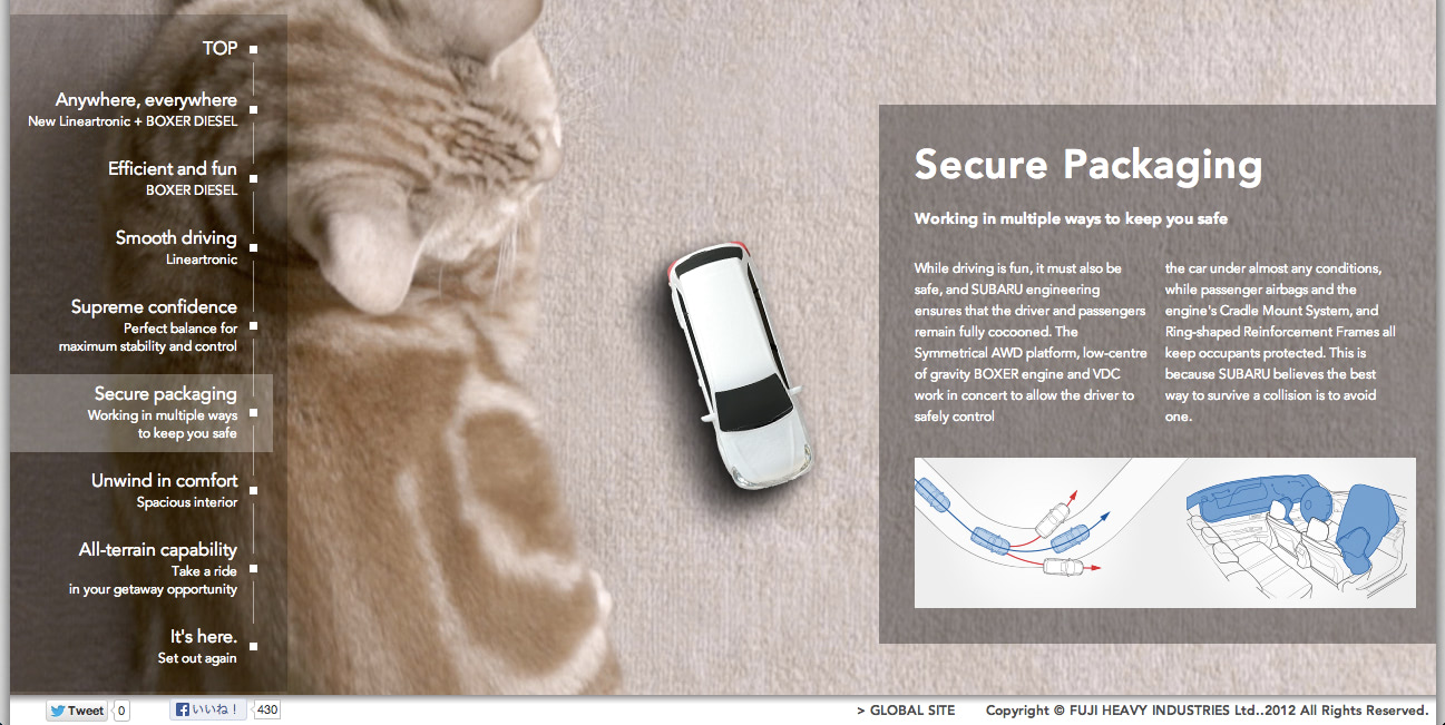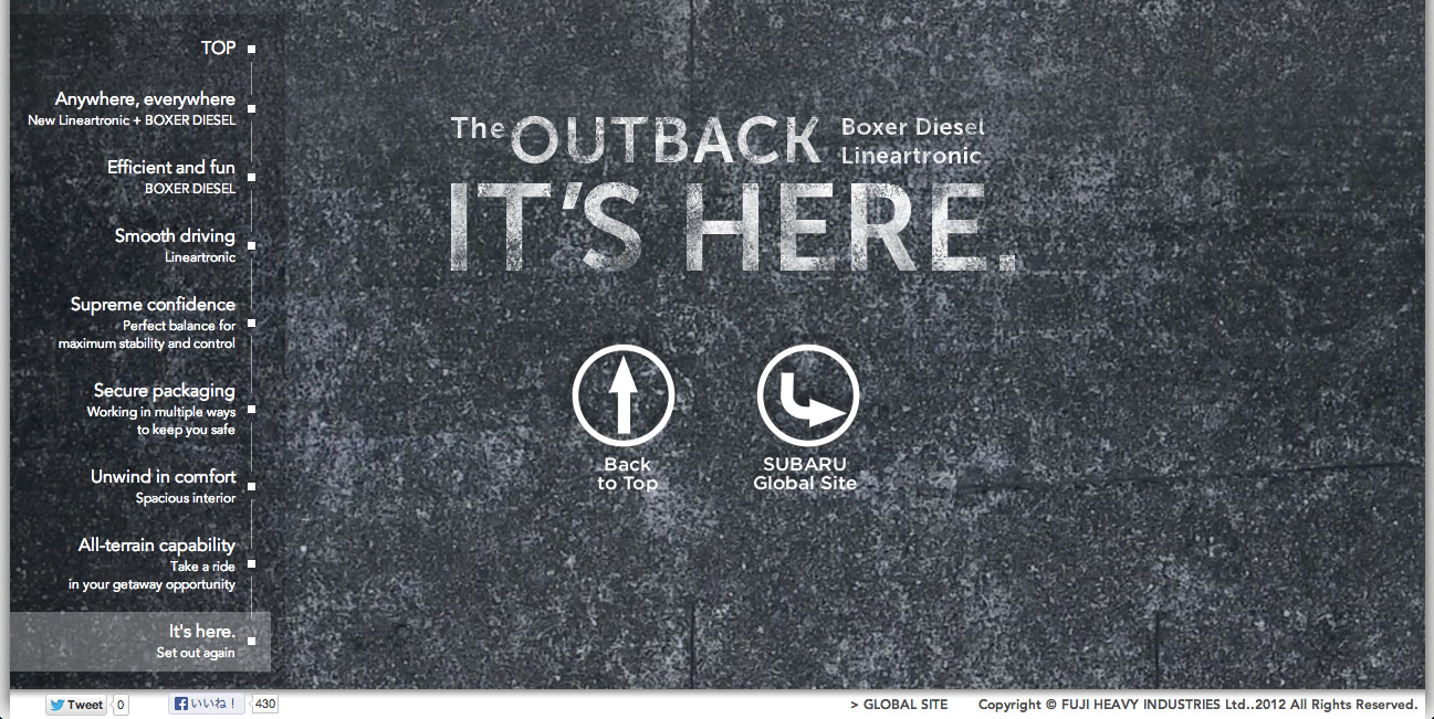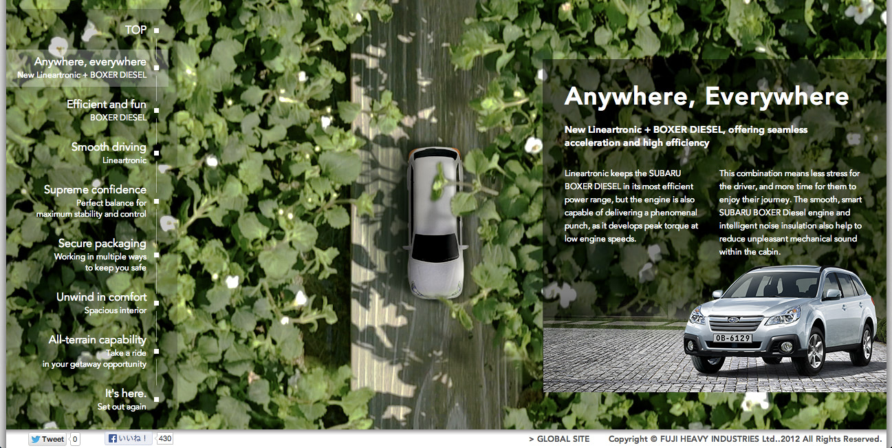 自動車メーカーのグローバル・プロモーションサイトを制作 ステーションワゴンとSUVのクロスオーバー車、SUBARU OUTBACKのグローバル・プロモーションサイト。ドイツの世界的なデザインアワード「iF Communication Designn Award 2014」のキャンペーンサイト部門にて受賞。 ユニバは、ウェブサイトを制作。スクロールに連動して、ミニチュアの車が家の中のいろいろなシーンを走っていくギミックを実装。走行する路面が変更される度に、スペックの説明が挿入される要素を入れた。