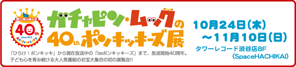 テレビ番組「ひらけ!ポンキッキ」が1973年に放送開始。現在放送中の「beポンキッキーズ」に至る、40年間の歴史を辿る「ガチャピン・ムックの40thポンキッキーズ展」がタワーレコード渋谷店にて開催。番組内で誕生したキャラクター、ガチャピン、ムックと一緒に遊べるインスタレーションを展示。