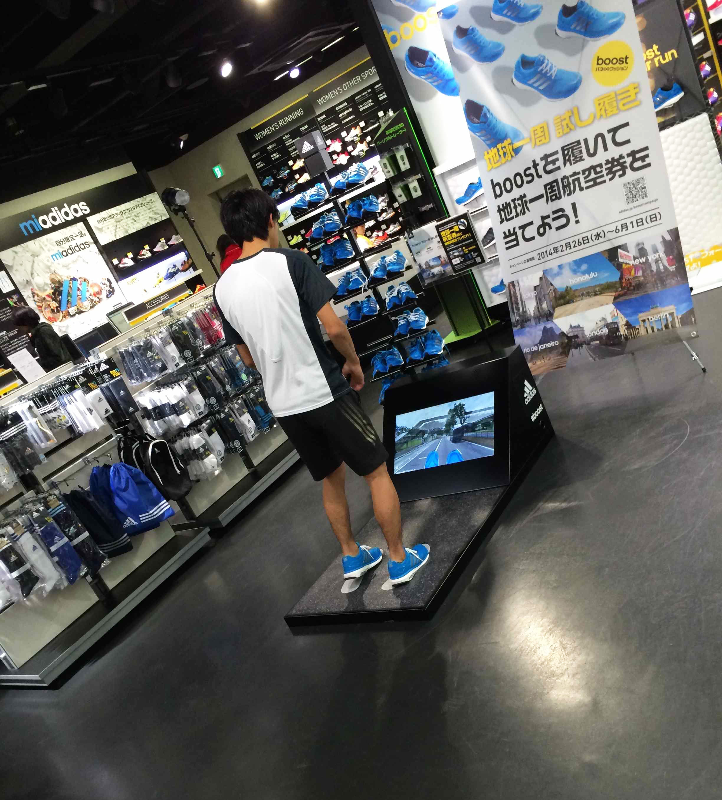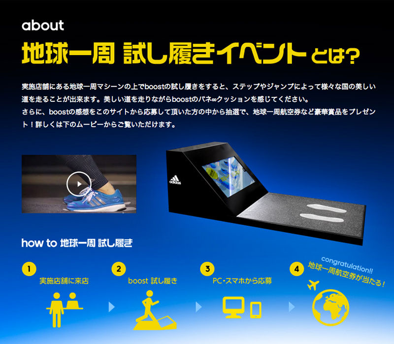 adidasのランニングシューズ「boost」の試し履きキャンペーン用筐体「地球一周マシーン」。筐体のセンサーの上で試し履きをすると、ステップやジャンプによって、ディスプレイ内に映る様々な国の美しい道を走ることができる。全国各地の店頭で展開し、長期に渡って多くの人に体験してもらうイベントで、シューズの耐久性とロバスト性を問う内容。