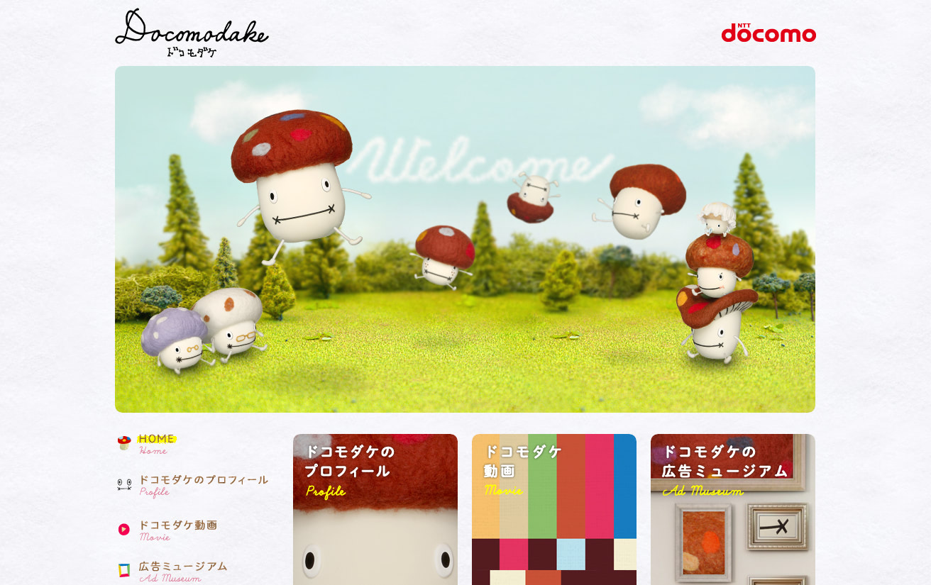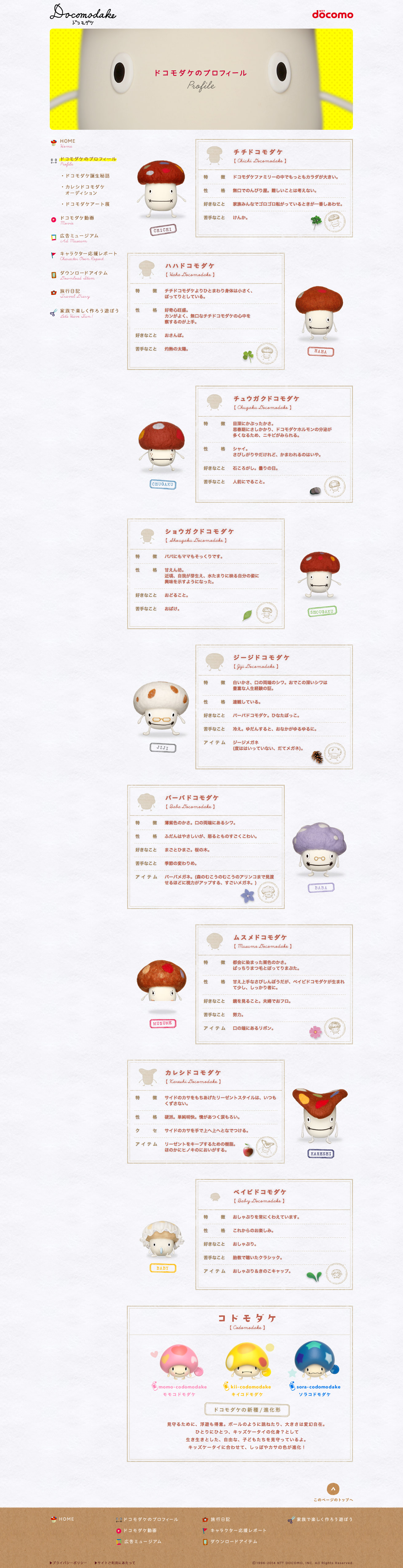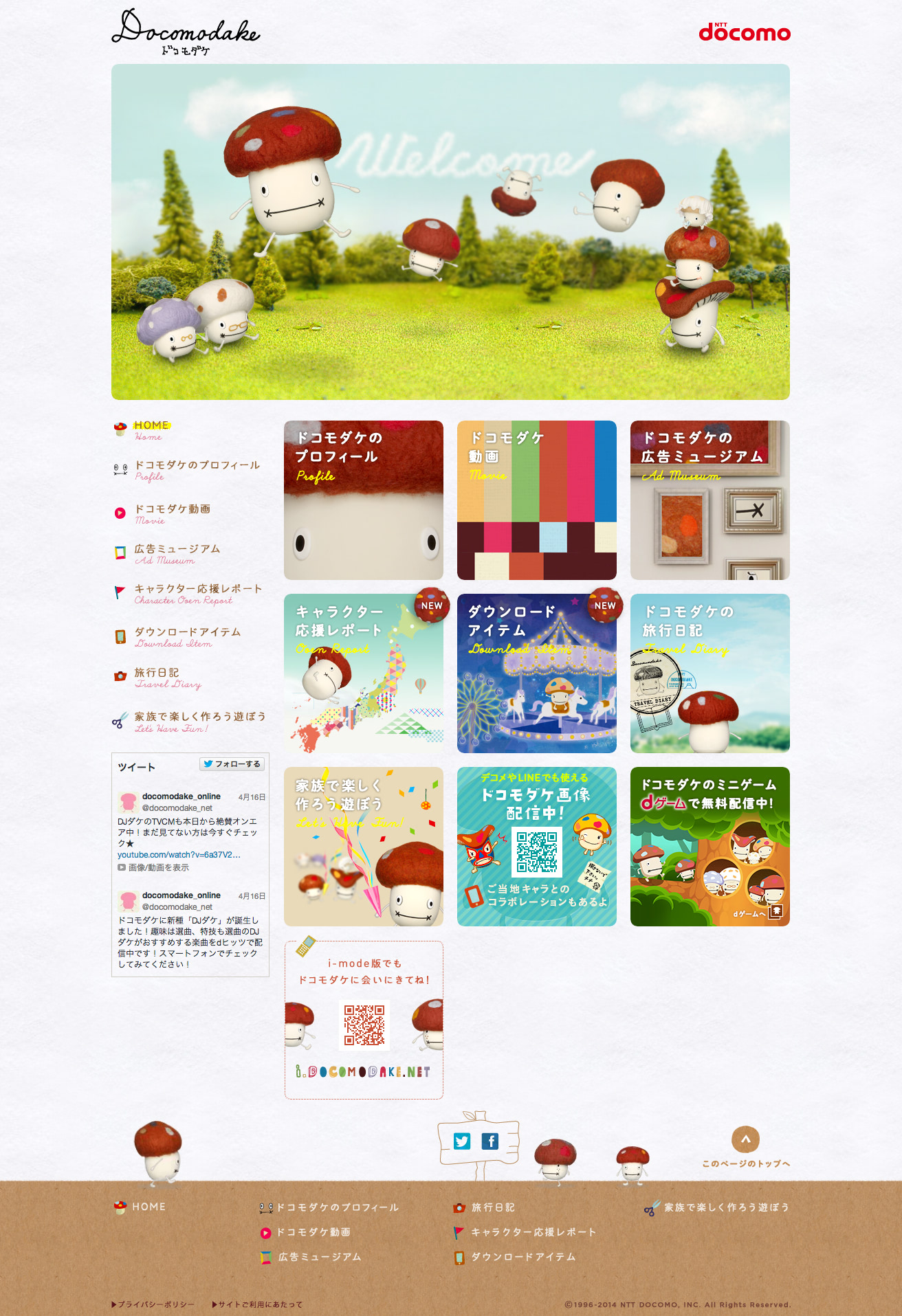携帯電話キャリアのマスコットキャラクター用オフィシャルサイトのフロントの構築 NTTドコモのマスコットキャラクター「ドコモダケ」のオフィシャルサイトのリニューアル。「ドコモダケ動画」「ドコモダケの広告ミュージアム」「ドコモダケたべものカレンダー」「ダウンロードアイテム」「キャラクター応援レポート」など、キャラクターの世界観を広げるコンテンツが並ぶ。 動画、画像、文章、ゲームなど、約10年分の大量のコンテンツがあるサイトのため、テンプレートシステムを利用し、管理や構築作業の省力化を図った。