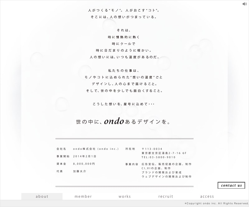 広告制作会社のコーポレートサイトの構築を担当 ウェブなどを手がける広告制作会社ondo inc.のコーポレートサイト。「世の中に、ondoあるデザインを」がコンセプト。 白をベースにした落ち着いた温度を感じさせるデザイン。背景に湧き水の動画を配置。音も鳴り、涼しげな雰囲気を演出。