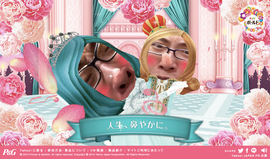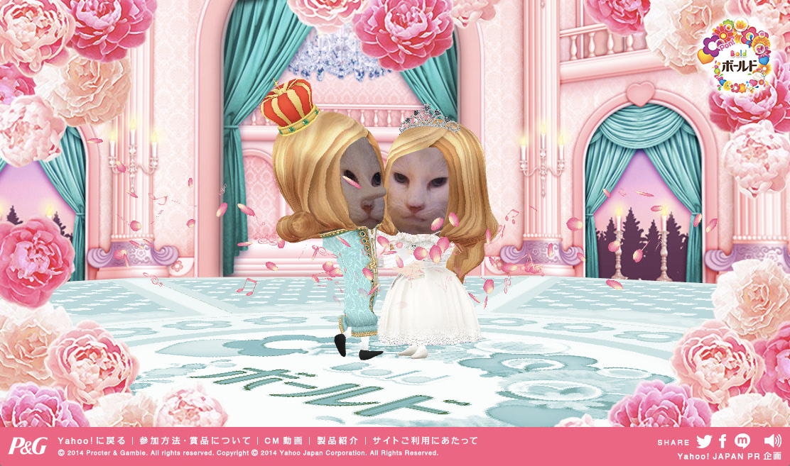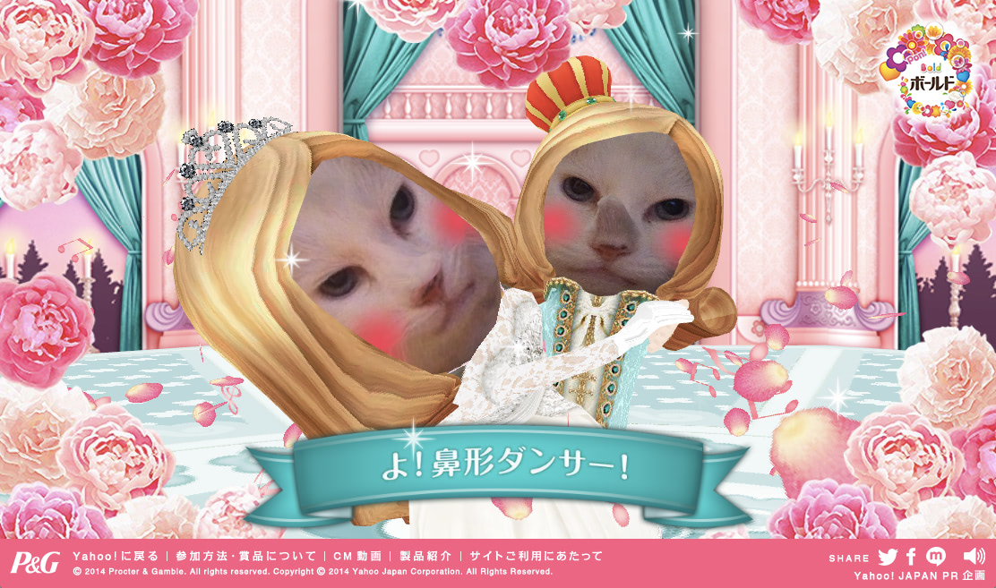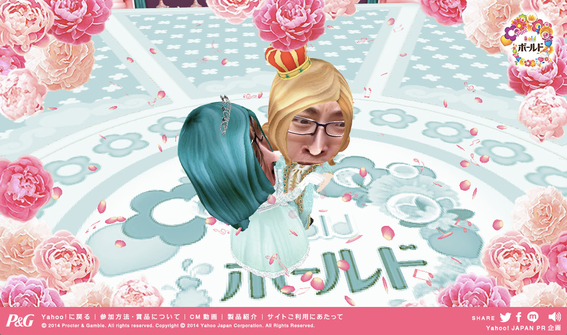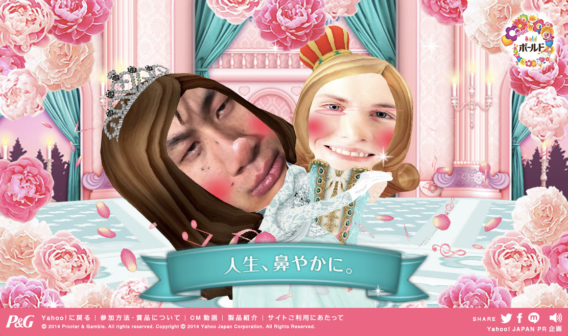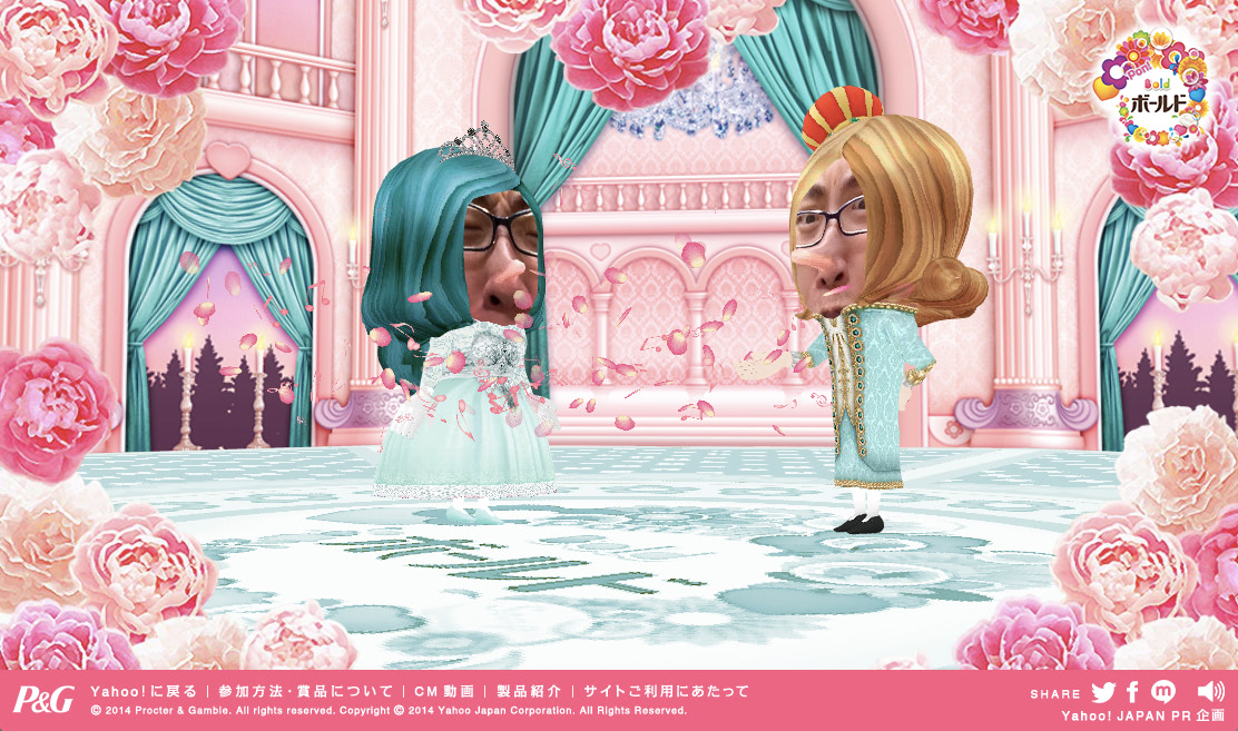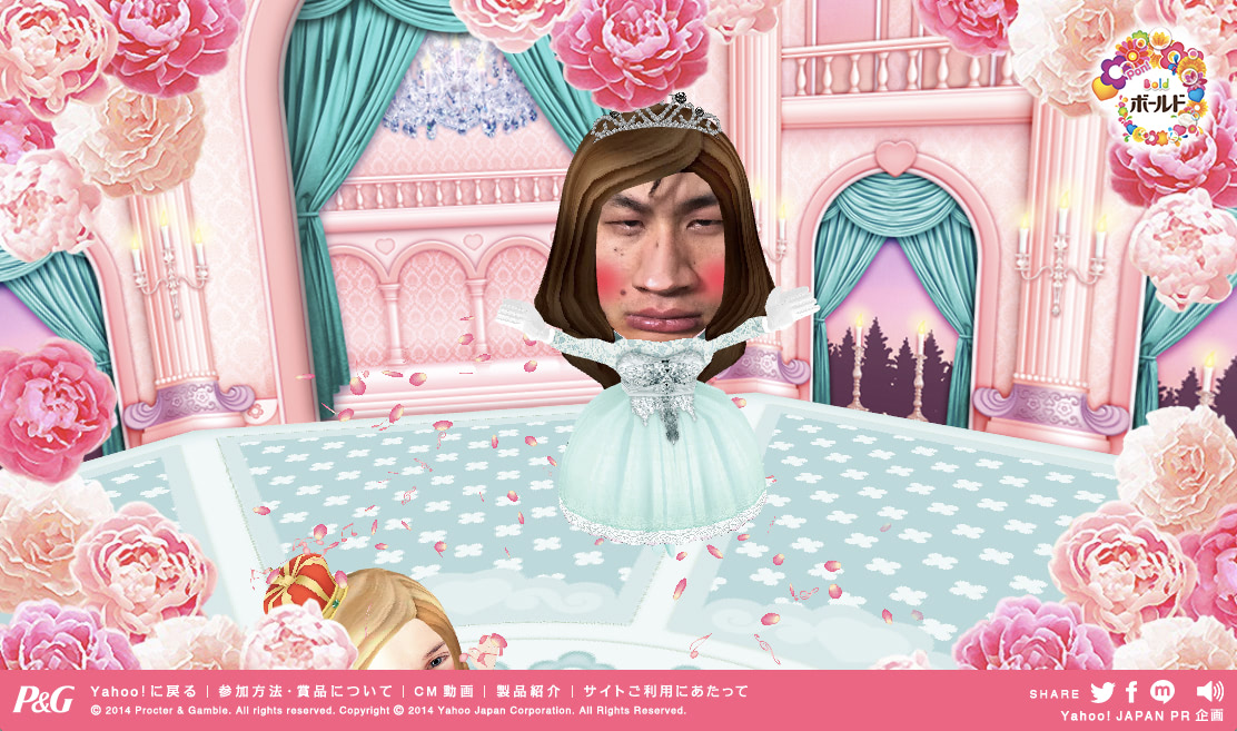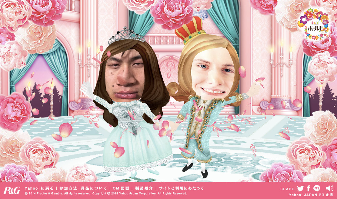 日用消費財メーカーP&Gの洗剤「ボールド」のキャンペーンサイト。顔写真をアップロードすると、顔写真を元にしたシンデレラと王子様が華麗に踊るダンスムービーが出来上がるシステムを制作 (王子様の顔も変更可能)。ダンスムービーをSNSでシェアすると「夢のシンデレラ体験」プレゼントに応募も可能。