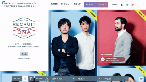 リクルートホールディングス2017年度新卒Web採用サイトの構築 ユニバは構造設計・フロントエンド実装を担当。ユーザがページ間をシームレスに移動できるように、XHR経由によるシームレスなローディングの実装・アニメーションの質感に注力した。また運営者の柔軟な更新を実現するため、テンプレートの細分化・ページ生成の自動化により、複雑なレイアウトの記事を容易に編集できるようにした。