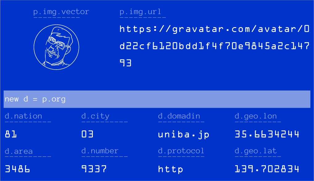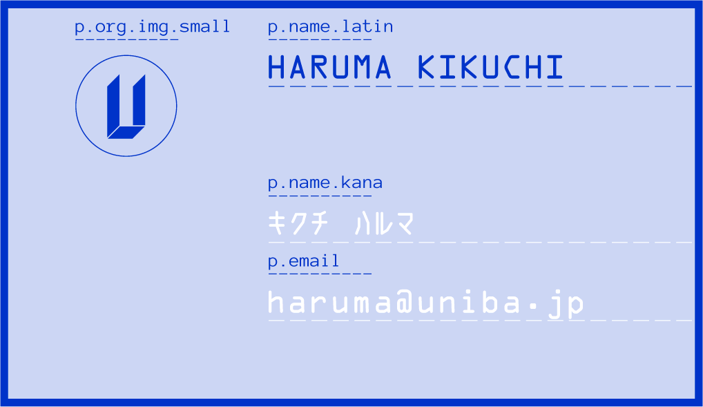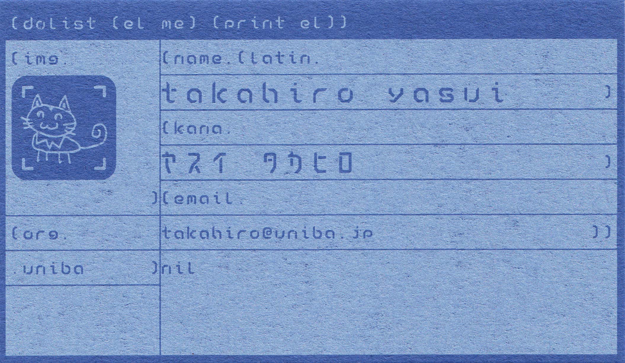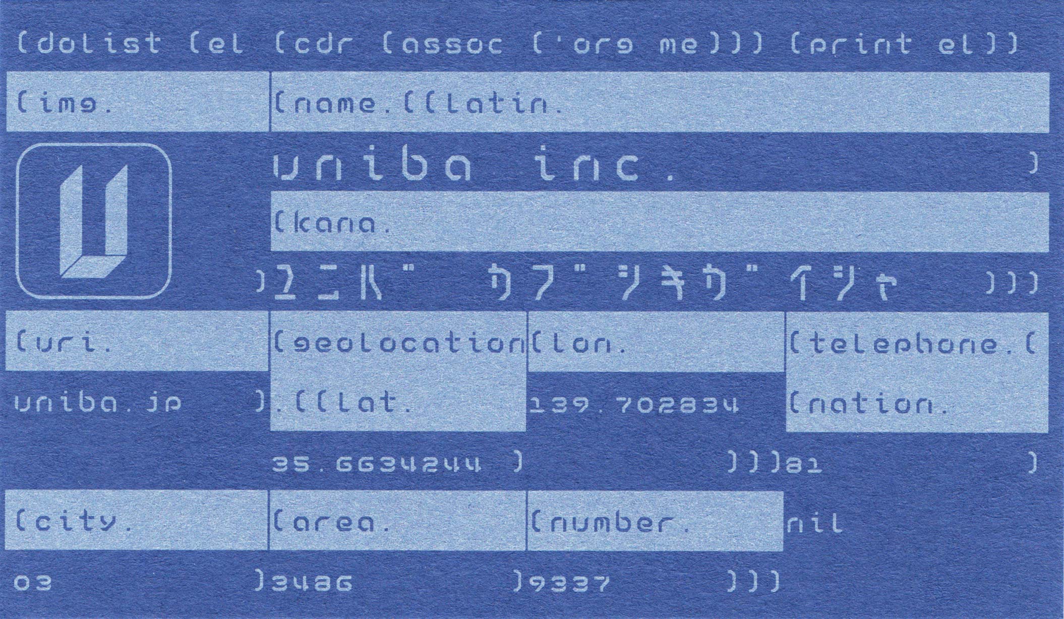 名刺には構造化された情報を表記しようと考えました。例えば、名刺の所有者個人 (me) とその要素としての名前 (me.name.latin / me.name.kana) やメールアドレス (me.email) があり、ユニバという組織 (uniba) の下位の要素としての緯度経度 (uniba.geolocation.lon / uniba.geolocation.lat) や市外局番 (uniba.telephine.city) がある、というようにデータ構造を作り、そのモデルが名刺という媒体に出力されて実態を得た、という想定をしました。具体的には、名刺の所有者を表現している Lisp のリストがあると想定して、そのリスト評価を開始するために、カードの上部にはリストを評価する命令が置かれています (dolist …の行) 。2行目以下には評価結果の要素名と値が並んで、名刺の情報を構成しています。