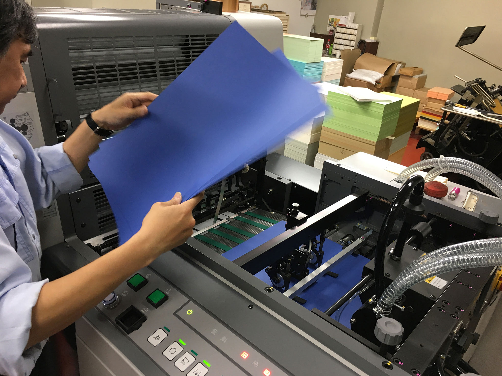 印画紙を使うわけにはいかなかったのですが、ジアゾ式印画紙の青から白に至る階調をイメージして、竹尾社の青い用紙「ビオトープ マゼランブルー 210kg」に白一色で刷ることにしました。当初は文字の細かい部分が潰れることや、インクの滲みなども、印刷技術のフィジカルな部分が感じられて面白いだろう、と思っていたのですが、最初の本機校正では小さい文字が読めないほどに潰れ、罫線が全く見えなくなってしまいました。ほとんど視覚的な調整をしないで機械的にレイアウト進めることを目指したものの、この点だけは対応が必要になりました。印刷の圧力によって印刷面が大きくなるため、抜きの文字について補正をかけて視認性を確保する調整を行いました。