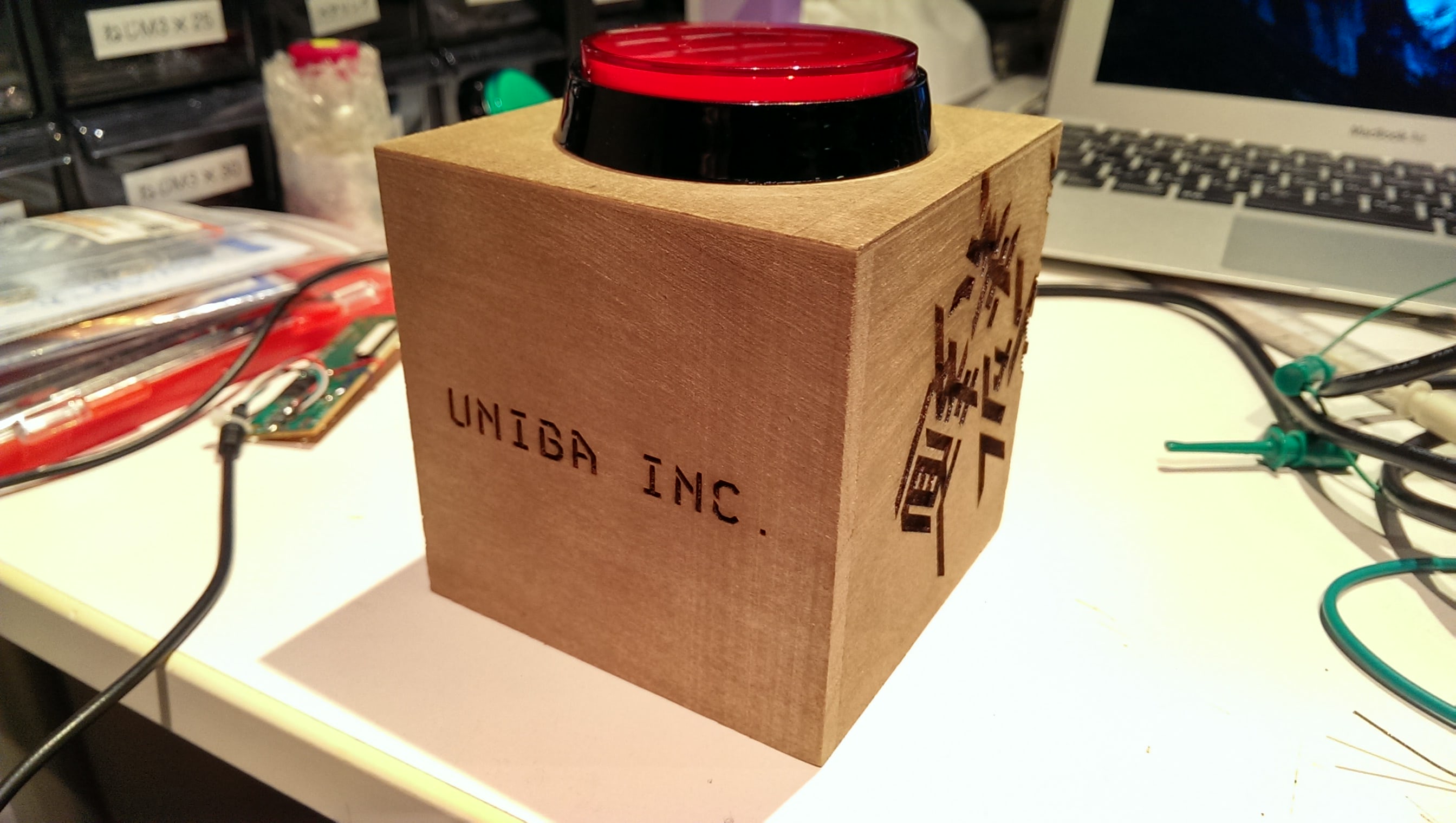 ヴァーチャル素麺のイメージが自然であることから、スイッチの筐体は木材を使用。筐体側面にはUNIBA新名刺用に作られたnewordrとヴァーチャル素麺ロゴをレーザーカッターで彫刻してある。ボタンの色は赤か緑かで意見が分かれたが存在感を演出するため赤色を採用。