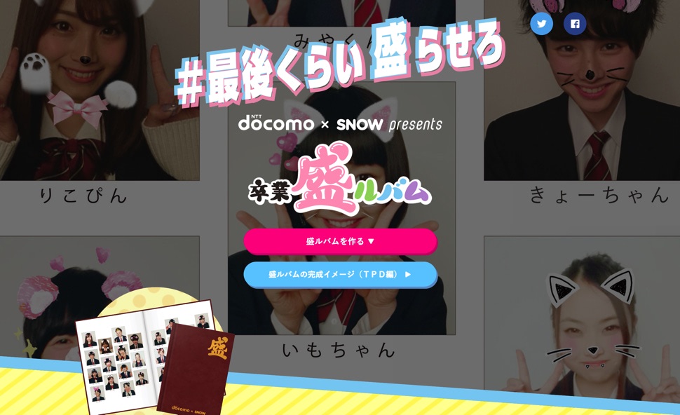 概要 カメラアプリSNOWで撮って作る卒業アルバム「盛ルバム」キャンペーンの企画として、monopo.incさんと一緒にWEB版ジェネレーターを制作しました。ユニバはフロントエンド・アルバム画像生成プログラムを担当。楽しくデコった写真・動画をアップロードして、最大で40名もの大ボリュームなアルバムも作成できます。(2017/3/31に公開終了) (文:Keiichi Tanifuji)