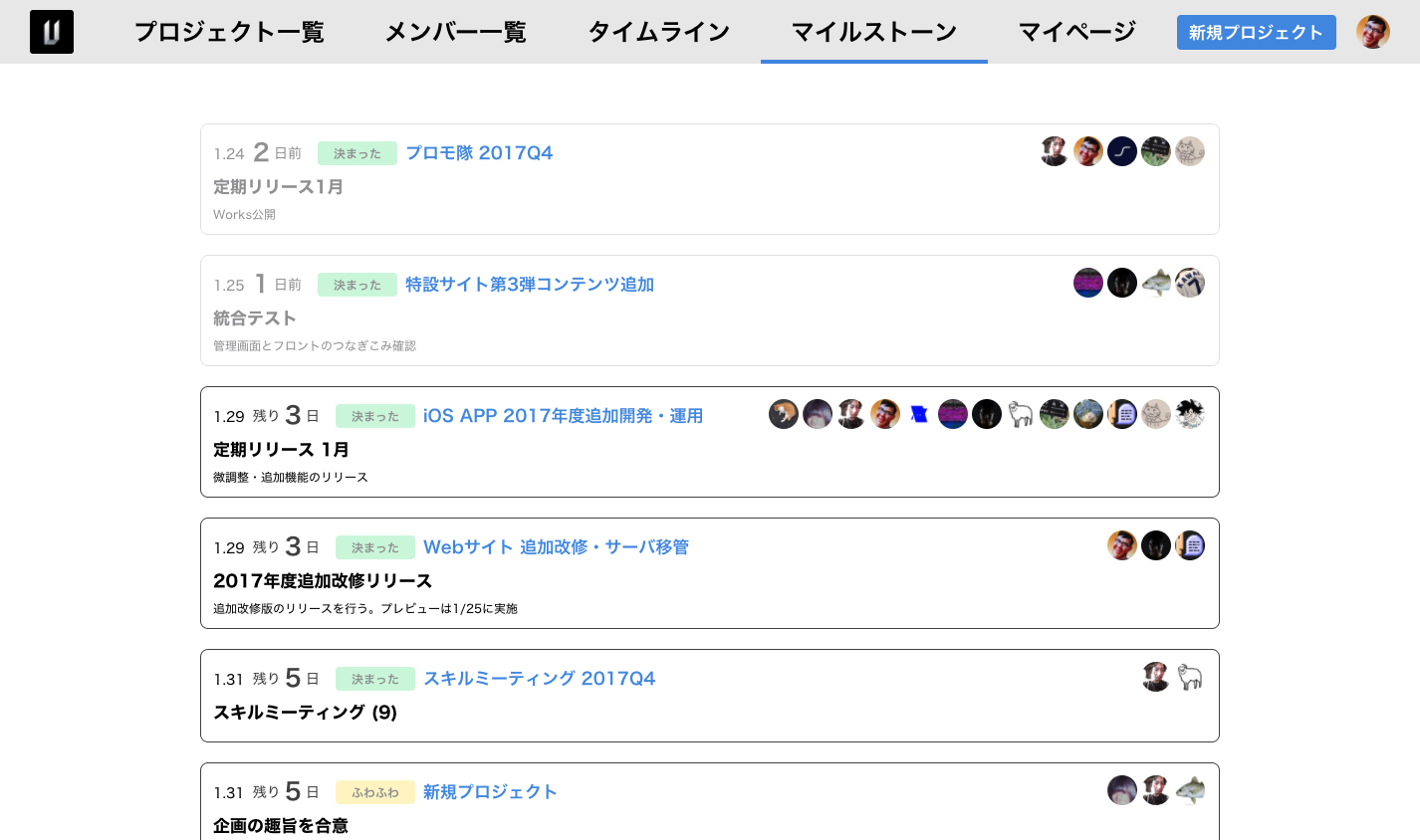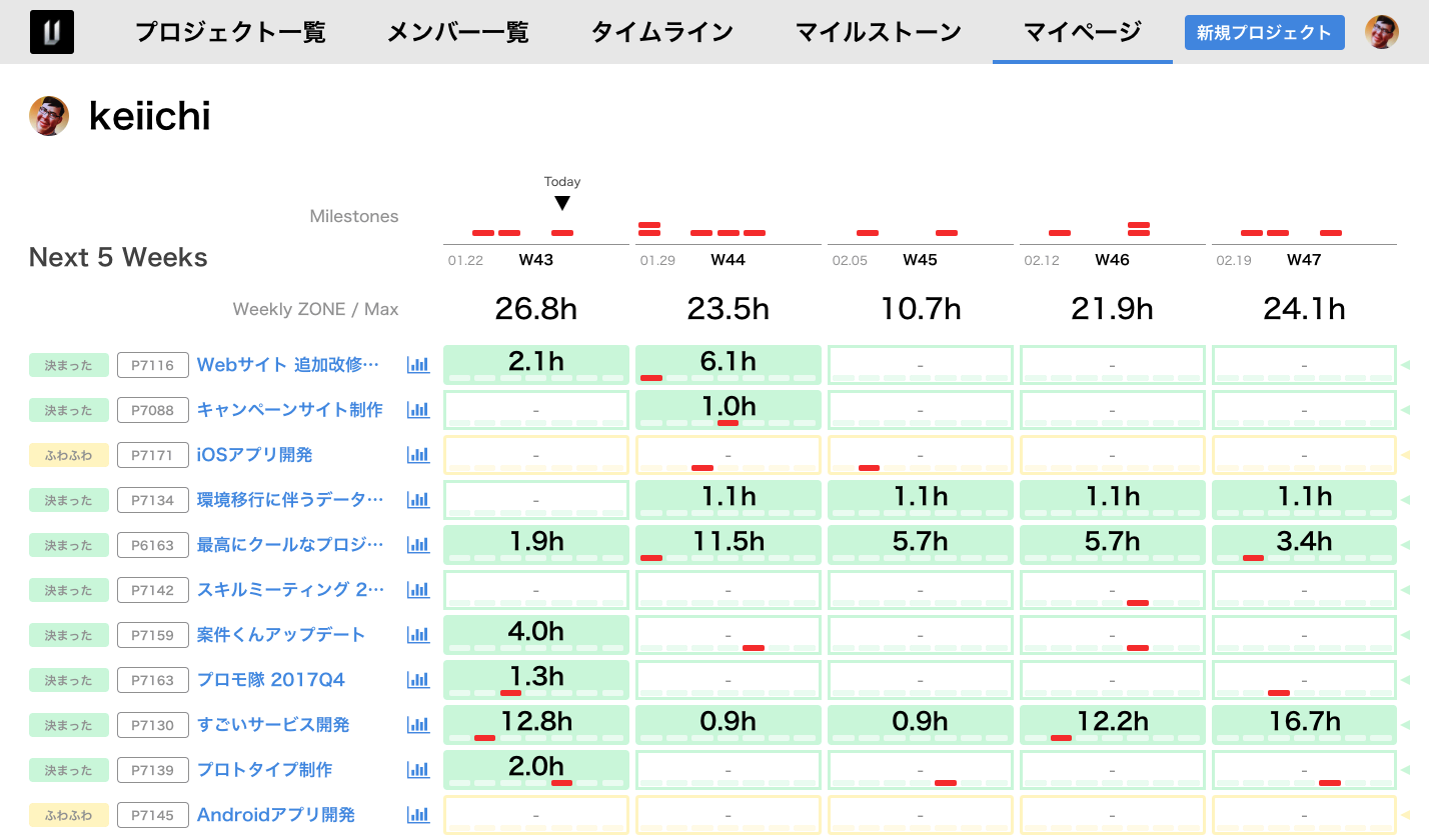 個人的にもっとも重要だと考えている改善点は「マイルストーン」という概念の導入です。プロジェクトのキックオフ時に、チームメンバーは案件くんを見ながらプロジェクトの完了までに必要なマイルストーンを設定し、実現に必要な時間を各人で見積もります。これまではプロジェクト全体の規模ををざっくりと見積もっていたのですが、見積の対象をマイルストーンに分割することで、より正確な将来の忙しさの予測ができるようになりました。また、次のステップまでに求められているアウトプットを事前に想定した見積時間の範囲中で出力する、という意識を習慣づけることができるようになりました。