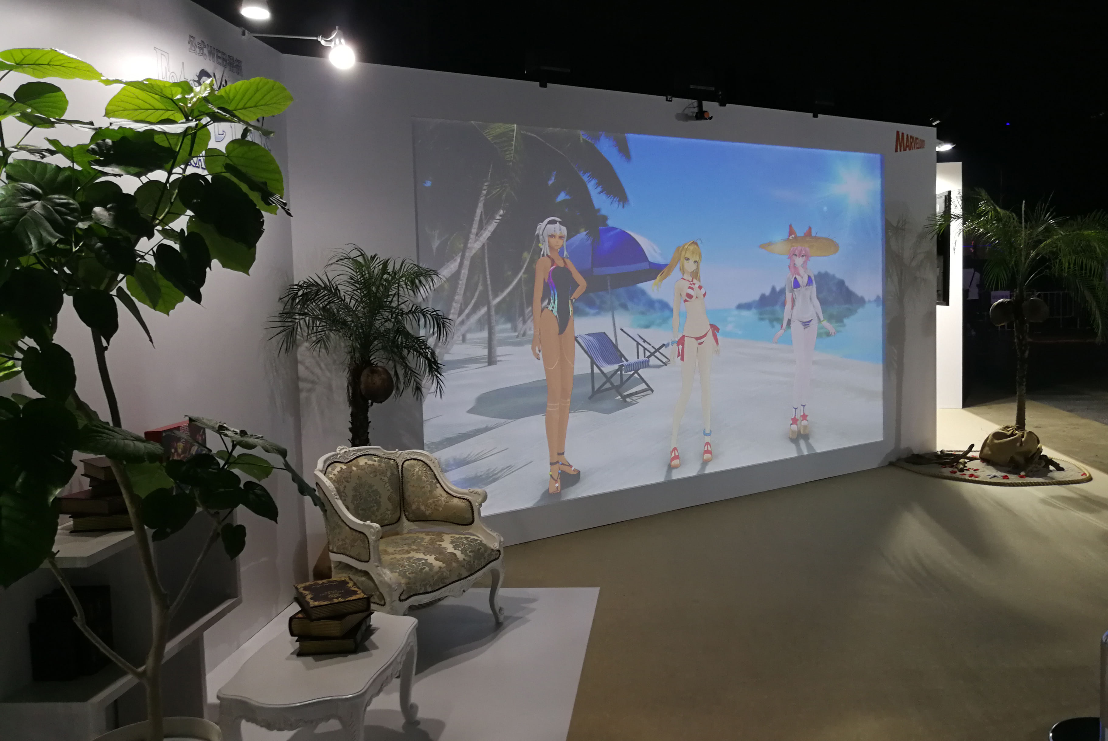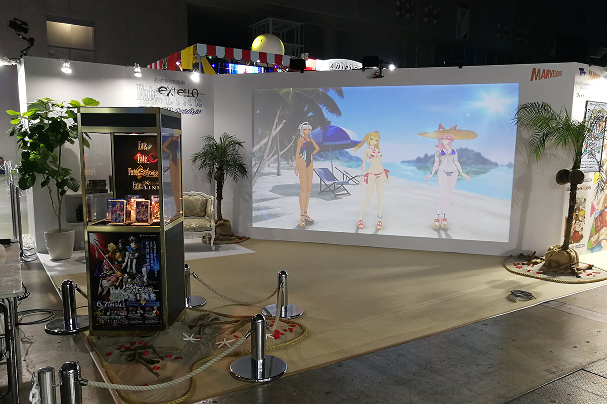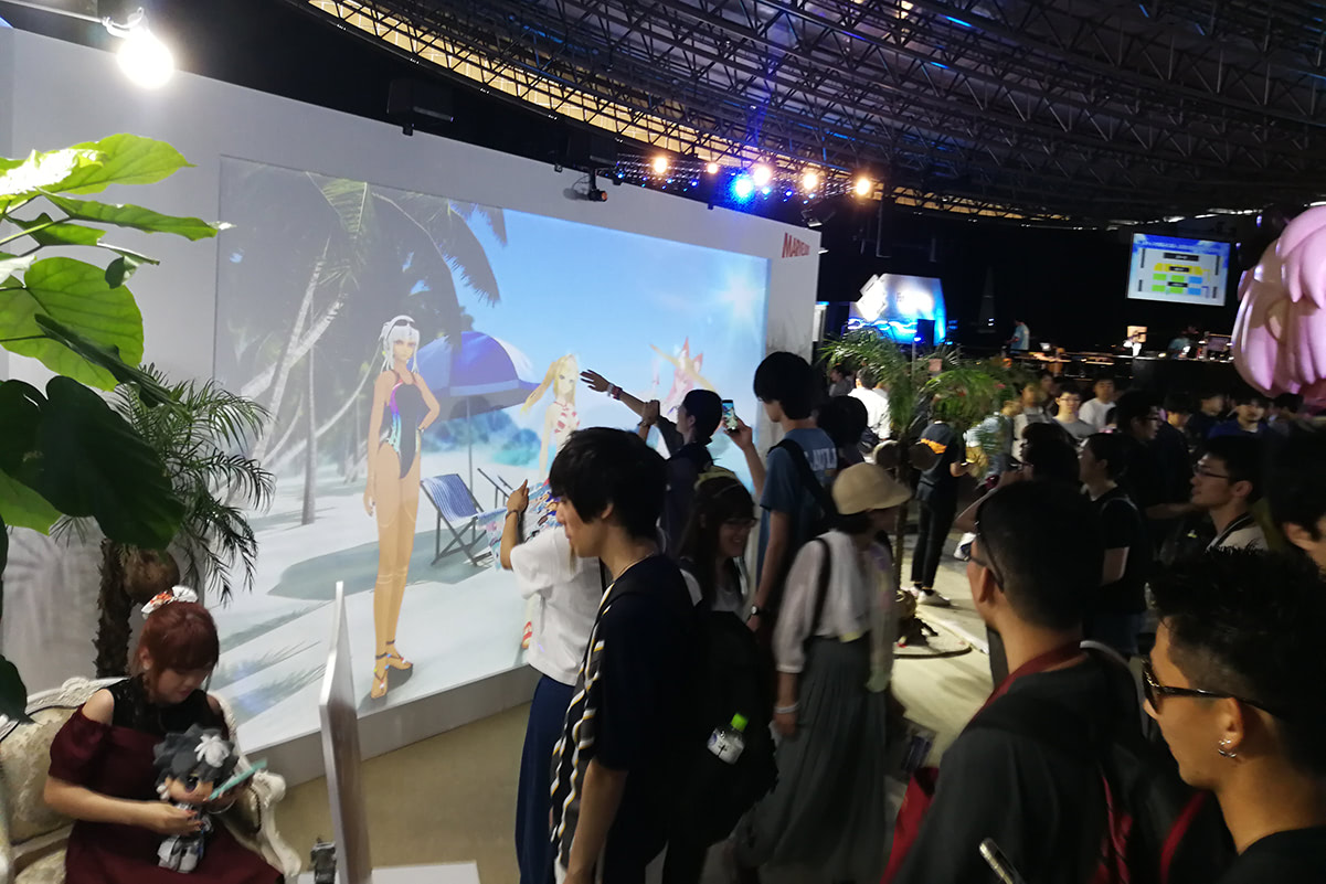 スマートフォン向けRPG「Fate/Grand Order」の公式リアルイベントである「Fate/Grand Order Fes. 2018 ~3rd Anniversary~」にて 株式会社マーベラスさまブース内、「水着サーヴァントふれあい体験コーナー」のシステム実装を担当いたしました。 ブース内の大型スクリーンに手をかざすとビーチでくつろぐ「ネロ」「玉藻の前」「アルテラ」が様々な反応を返してくれます。 触れる位置によっては特殊なモーションとセリフが組み込まれており、多くの来場者が真夏のビーチでサーヴァントと楽しんで触れ合える場所になりました。