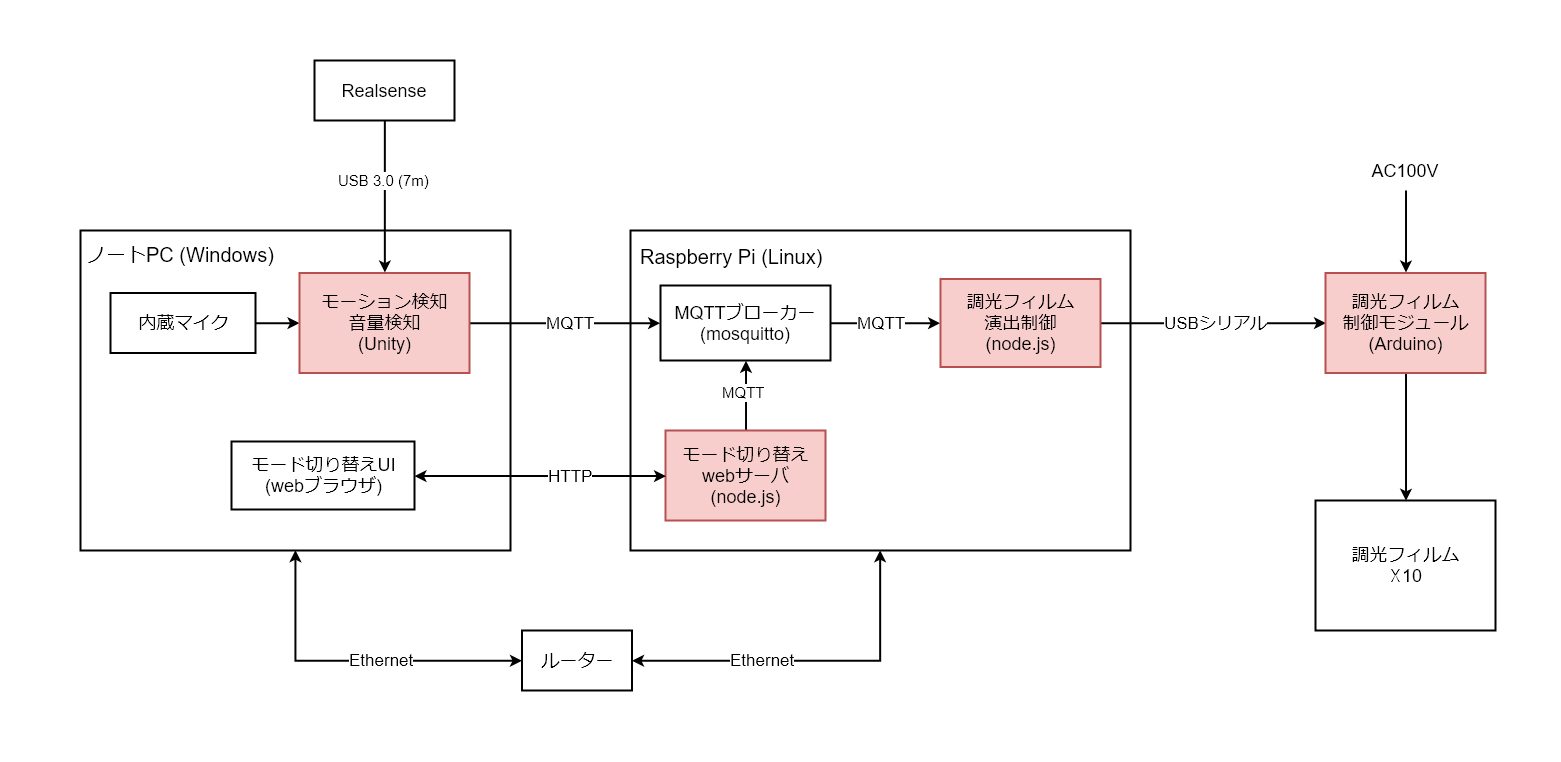 各機能を処理するコードはMQTT通信で結ばれています。人物検出の部分はMicrosoft社のKinectが販売終了になってしまっているため、代替手段を検討した結果、以前から気になっていたIntel社のRealsense(D435i)を導入しました。