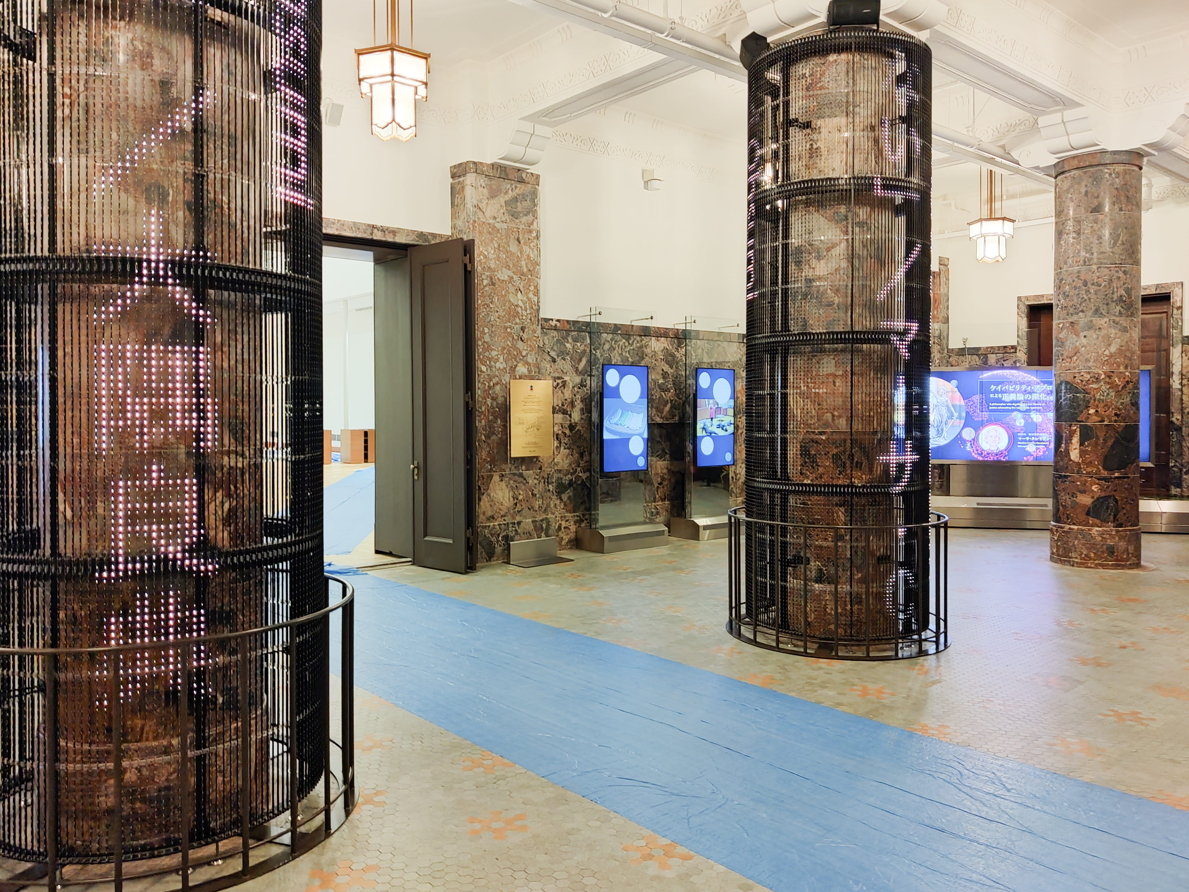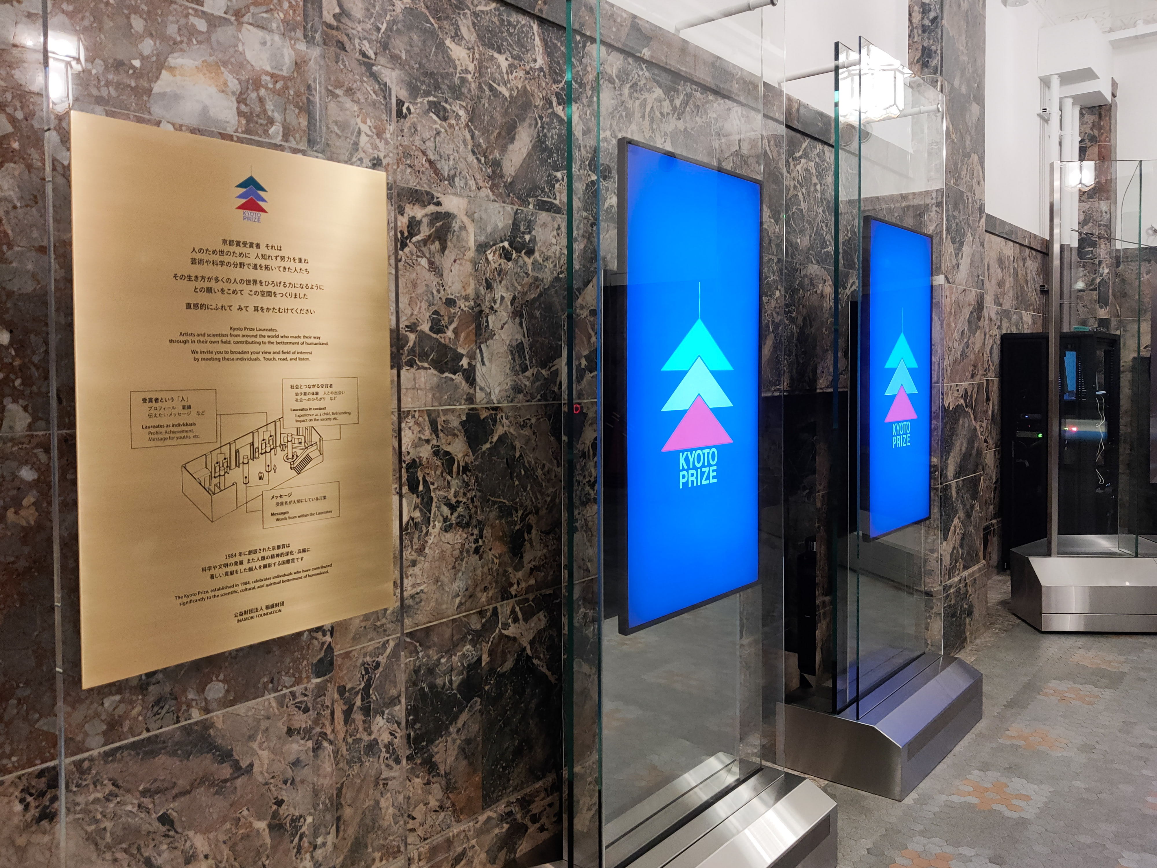 90年近く前に立てられた大理石の柱の周囲に、現代の技術でデジタルサイネージの演出を施しました。公開時点では、演出のアニメーションとともに京都賞受賞者のコメントが流れていきますが、このコンテンツは各種の告知などのため文言を自由に入れ替えられる管理機能も持っています。